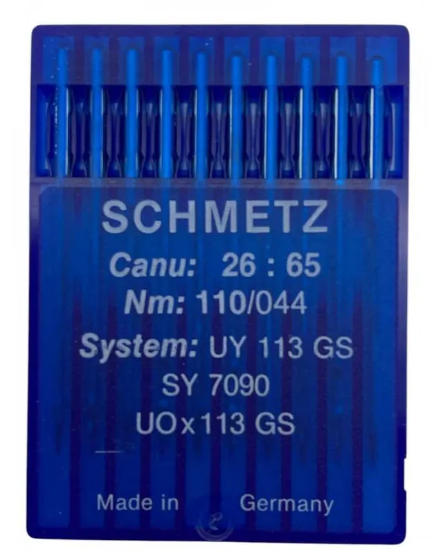 Set di 10 aghi Schmetz, modello Canu 26:65 NM 110/044, compatibili con il sistema UY 113 GS SY 7090 UOX113 GS. Realizzati in 100% acciaio, ideali per macchine da cucire industriali e tessuti pesanti, garantiscono cuciture precise e durature.