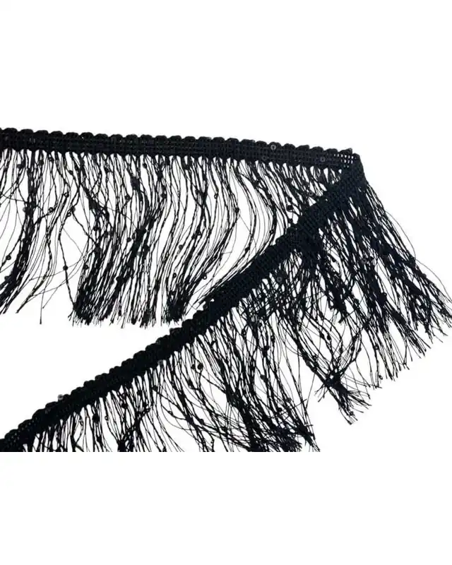 Passamaneria con frangia in filo nero, arricchita da micro paillettes scintillanti, ideale per aggiungere un tocco elegante e glamour a capi d’abbigliamento, accessori e decorazioni sartoriali. Con un’altezza di 10 cm, crea un effetto dinamico e raffinato, perfetto per look sofisticati e dettagli di stile.