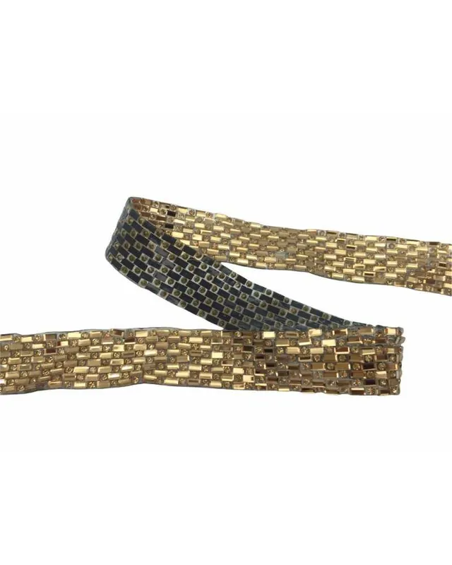 Striscia decorativa con strass incastonati in motivo geometrico tondo e rettangolare, su base flessibile e termoadesiva. Ideale per personalizzare capi e accessori con un tocco brillante e moderno.