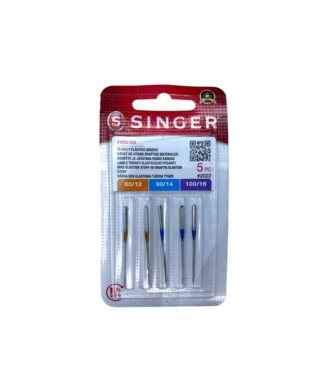 Set da 5 aghi Singer Overlock 2022, ideali per lavorare lana, tessuti elastici e pesanti. Misure 80/12, 90/14, 100/16. Aghi resistenti per cuciture precise su macchine overlock. Prezzo per 5 aghi.