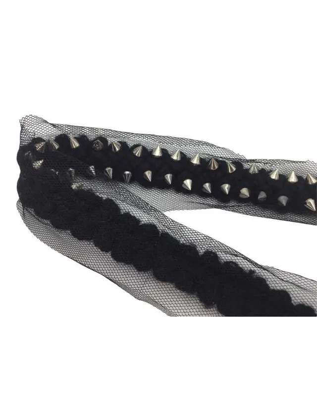 Un bordo decorativo dal look grintoso e moderno, ideale per rifinire capi e accessori con un tocco rock e deciso. La base in lana nera è impreziosita da borchie coniche in argento scuro, perfette per dare carattere a ogni creazione.