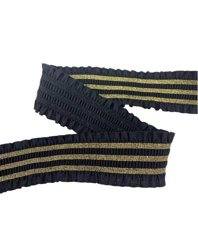 ✔ Design: Passamaneria elastica con arricciatura tipo rouches e dettagli in oro lurex su base nera, per un effetto elegante e scintillante