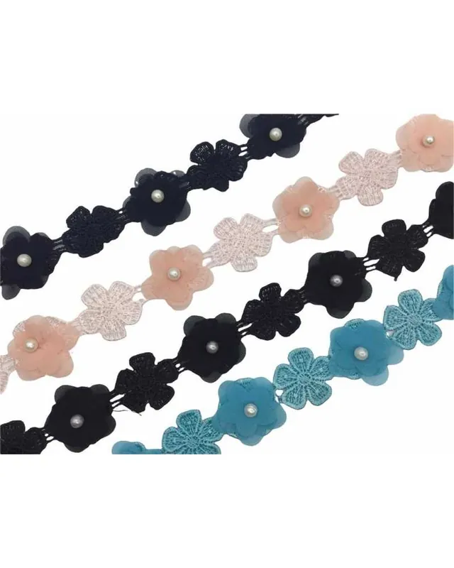 La passamaneria è composta da fiori in georgette alternati a elementi macramè, con perle bianche cucite al centro. Il bordo è flessibile e ritagliabile, con una resa visiva sofisticata e luminosa, ideale per applicazioni su tessuti leggeri e capi moda. Perfetta per dettagli romantici e decorazioni handmade.