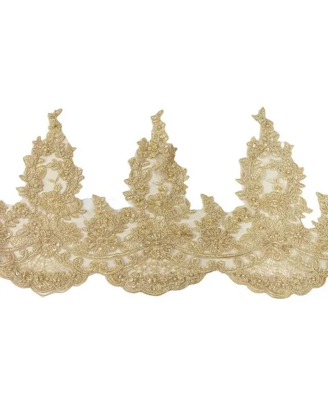 La passamaneria è realizzata su tulle ecrù leggero, con ricamo rebrodè in rilievo che disegna fiori e foglie. Il bordo superiore è a punta, con effetto corona, mentre quello inferiore è smerlato, creando un profilo elegante e scenografico.