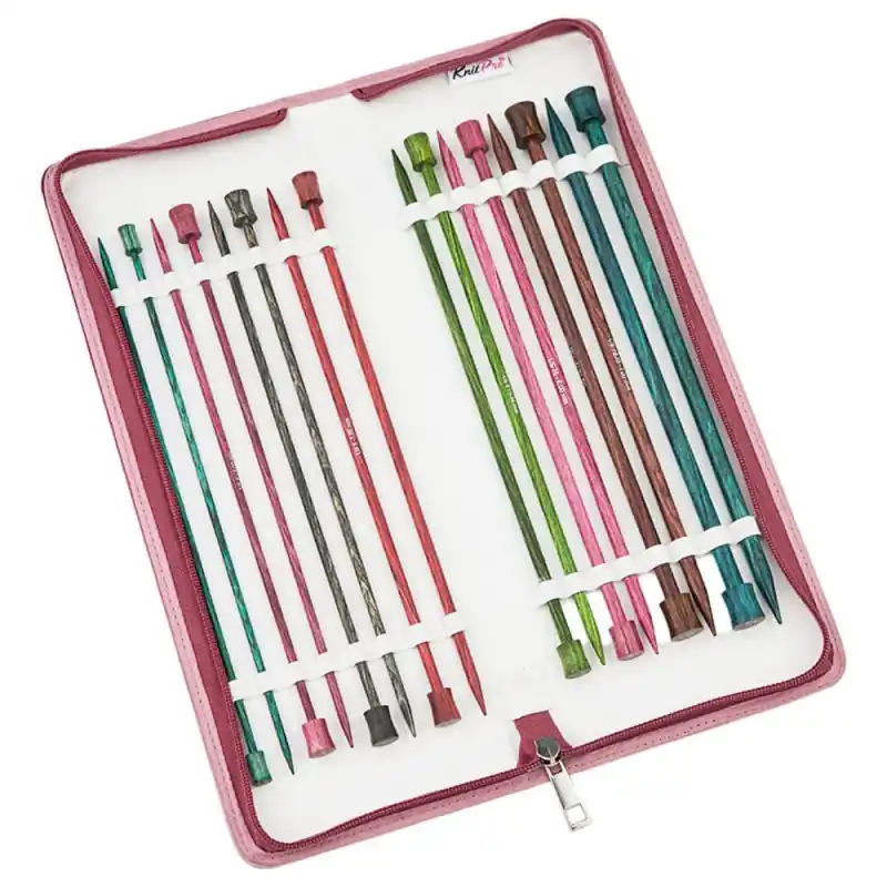 I ferri sono alloggiati in un elegante astuccio con cerniera nei toni del rosa e del bordeaux, ideale per tenerli organizzati e protetti. Sia i principianti che gli esperti di maglia troveranno in questo set uno strumento indispensabile per i loro progetti creativi.