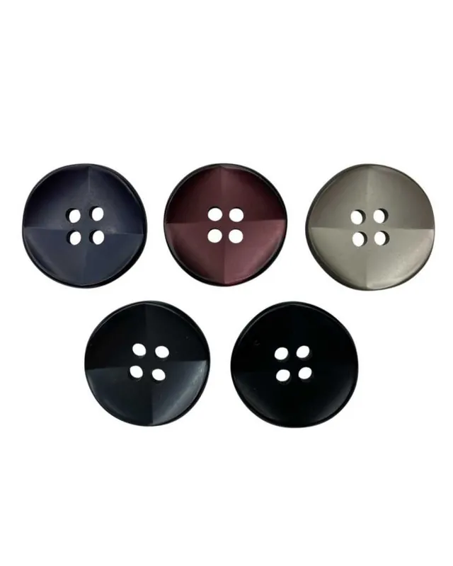 Bottone tondo in nylon e poliestere, finitura opaca con superficie lineata e bordo leggermente stondato. Diametro 35 mm, corrispondente alla linea 54, con 4 fori centrali per cucitura. Design geometrico a faccette, ideale per giacche, cappotti, abbigliamento tecnico, accessori moda e progetti sartoriali.
