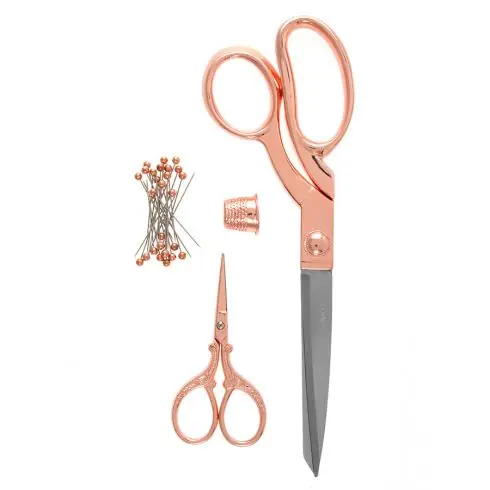 Set di forbici Milward contenente 2 tipi di forbici (21,5 cm e 9 cm) con manici in oro rosa, oltre a 25 spilli e un ditale anch’essi in oro rosa.
