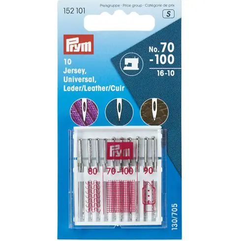 Astuccio in plastica su cartoncino con 10 aghi di qualità superiore per macchina da cucire standard 130/705 H con tacco piatto.