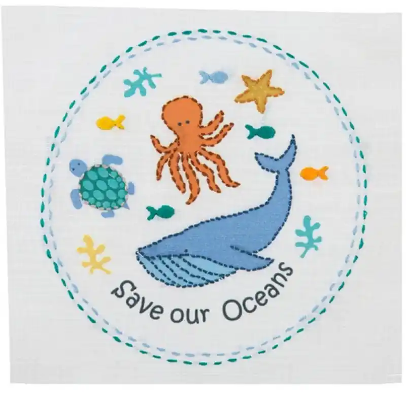 Il Kit di ricamo Save Our Seas della collezione 1st Kit contiene tutti i materiali necessari per ricamare una balena, un polpo e altre creature marine con un messaggio ecologico fondamentale. Ideale per coloro che vogliono imparare questa tecnica di ricamo. Perfetto sia per i bambini che gli adulti!