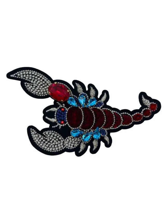 Applicazione Termoadesiva Patch Scorpione Ricamo Filo Argento Velluto Strass Pietre Cucite 19,5×7 Cm Ultimissimo Modello