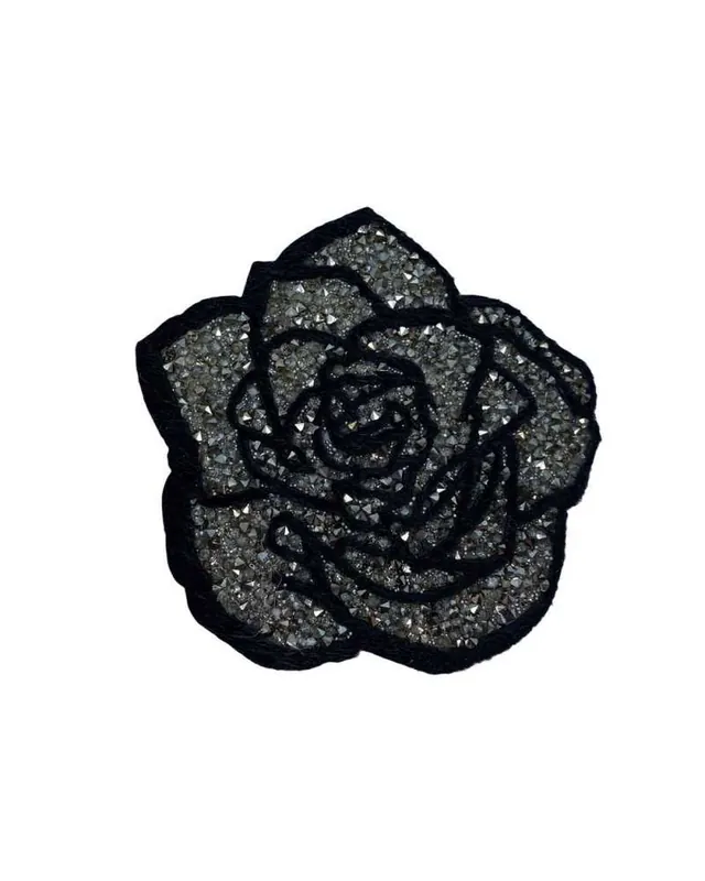 Applicazione Termoadesiva Patch Ricamo Nero Strass Conici Argento 8 Cm