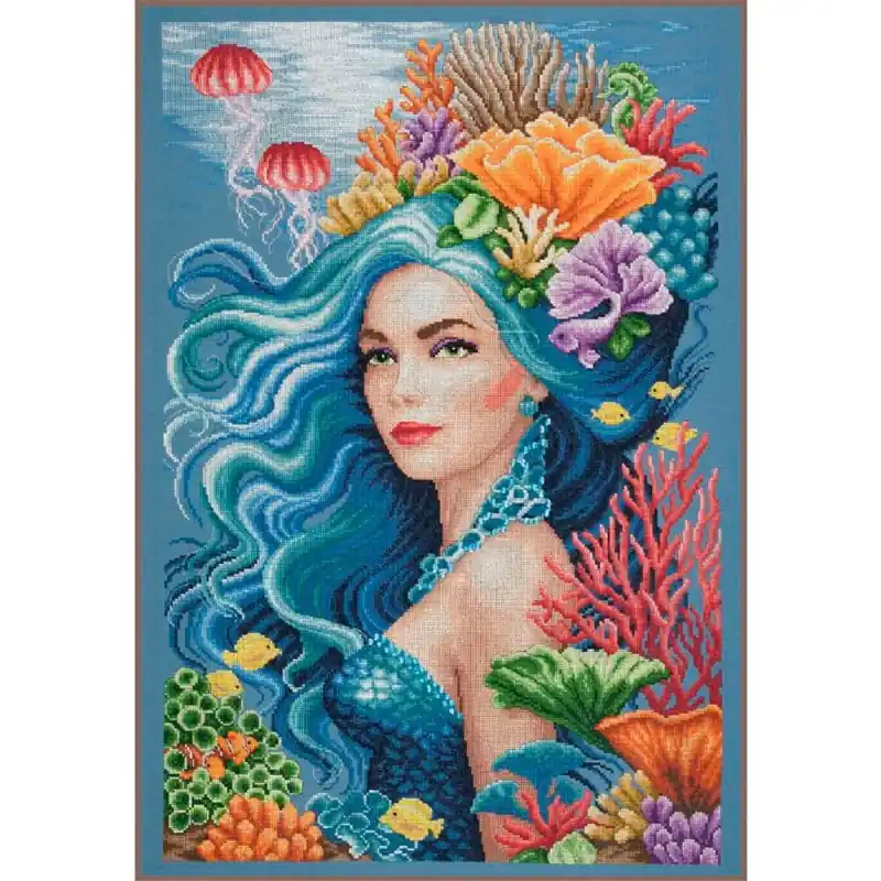 Immergiti in un progetto pieno di calma, dettaglio ed eleganza con il Kit di Punto Croce Beauty of the Sea di Lanarte. Questo spettacolare design di grande formato rappresenta una maestosa sirena circondata da coralli, pesci tropicali e meduse, con una chioma ondulata che si fonde con le correnti marine.