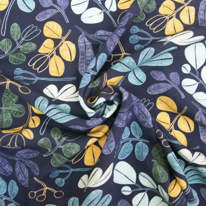 Il Tessuto Ecoviscosa Katia – Havana è uno squisito tessuto realizzato al 100% in viscosa ottenuta da legno e cellulosa sostenibili. Questo tessuto presenta un delicato motivo floreale nei toni del blu, del verde e del giallo su uno sfondo blu marino. Il tessuto in viscosa Havana di Katia Fabrics ha un drappeggio elegante, ideale per realizzare abiti, gonne o camicette da donna, aggiungendo un tocco di stile alle vostre creazioni.