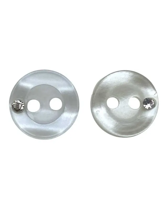 Bottoncino Decorativo – 2 Buchi – Ø 12 mm – Con Strass – Poliestere Bianco / Bianco Sposa Lineato 16 Bottoncino elegante con finitura perlescente e strass incastonato, perfetto per rifinire abiti da cerimonia, camicie, bluse, cardigan e accessori handmade. Disponibile in bianco ottico e bianco sposa lineato, dona un tocco luminoso e raffinato a ogni progetto sartoriale.