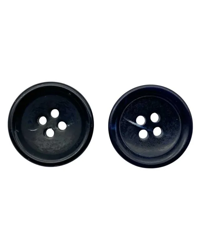 Bottone in poliestere da 23 mm con 4 fori e incavo piatto. Disponibile in nero e blu notte, con finitura scheggiata. Modello Lineato 36, ideale per camicie, pantaloni e cucito creativo.