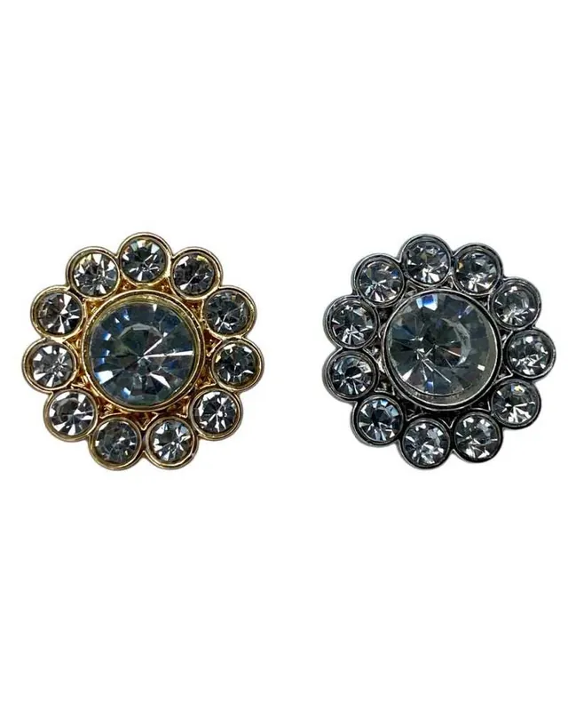 Elegante bottone tondo con un delicato fiore al centro, impreziosito da strass scintillanti. Il gambo in metallo lo rende ideale per decorare abiti, accessori e progetti di sartoria di alta classe. Disponibile in due splendide finiture: oro e argento.