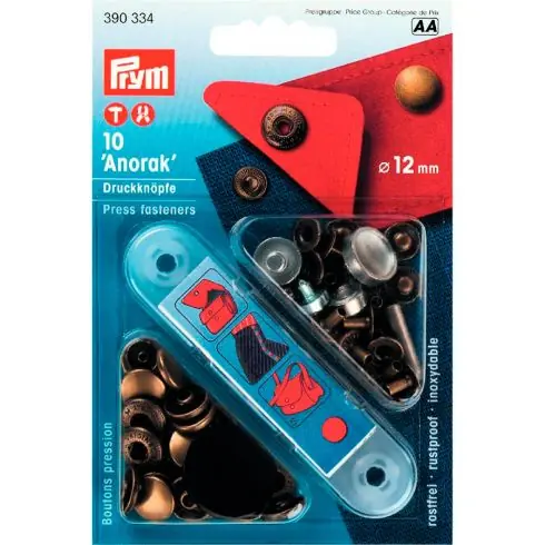 10 chiusure a scatto Anorak 12 mm in ottone inox colore antico. Per giacca a vento, abiti, gonne, pellami pregiati. Fornito con un piccolo attrezzo di montaggio. Da fissare con martello o clip Vario Codice PRY n°390900.