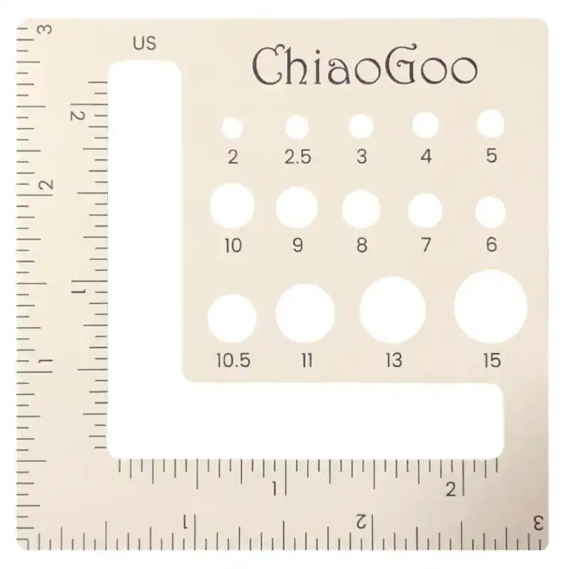 Il Calibro per Ferri di ChiaoGoo è un accessorio perfetto per misurare lo spessore dei tuoi ferri da maglia. Presenta le misure in centimetri e pollici.