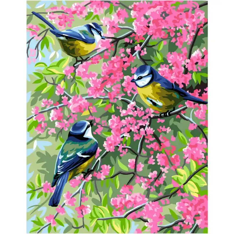 Il Canovaccio Royal Paris The Blue Chickadees & Flowers di Anchor permette di ricamare a mezzo punto diverse cinciallegre posate sul ramo d’un albero pieno di fiori.
