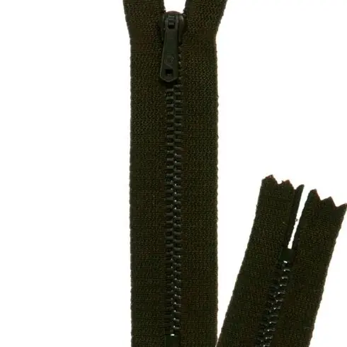 Chiusura eclair speciale Pantaloni color Kaki Scuro. Il colore della cerniera è simile a quello del tessuto. Chiusura, di alta qualità, molto resistente. Catena in metallo da 4 mm.