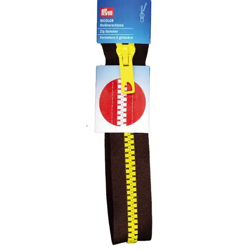 Chiusura a cerniera separabile a due colori, marrone scuro/giallo. Dimensione della maglia 8 mm. Lunghezza 40 cm.