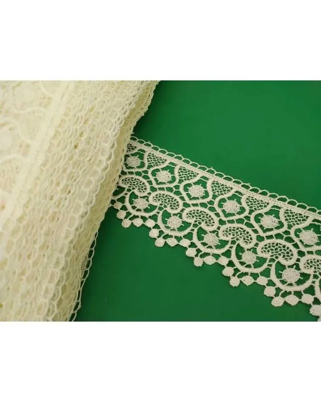 Eleva i tuoi progetti sartoriali con questa passamaneria in pizzo macramè merletto in color panna. Con un’altezza di 6 cm, il suo raffinato design presenta motivi a fiore, forme ovale e archi sinuosi, per un effetto decorativo unico.