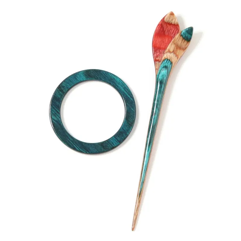 Lo Spillone ferma scialli Flora Lily di KnitPro è composto da due pezzi: un meraviglioso spillo multicolore e un circolo in tonalità verde vistose che permettono di collegare due pezzi della lavorazione insieme in modo forte e sicuro. Entrambi i due pezzi sono realizzati in legno di betulla laminato, colorati con diversi colori per dare un aspetto decorativo molto originale.