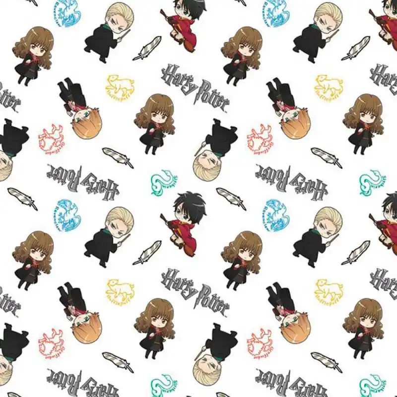 Dalla fantasia molto originale, il tessuto ritrae i principali personaggi della magica saga Harry Potter e i simboli delle casate della scuola Hogwarts, su uno sfondo bianco. Una stampa incantevole, ideale per gli appassionati della saga di film del mago Harry.