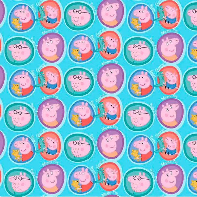 Un tessuto dalla fantasia incredibile e coloratissima, ispirata dalla famosa serie d’animazione Peppa Pig. Presenta motivi, simili a sigilli, di questa famiglia di maialini: la protagonista Peppa, il fratellino George e i genitori mamma Pig e papà Pig. Lo sfondo del tessuto è azzurro vibrante.