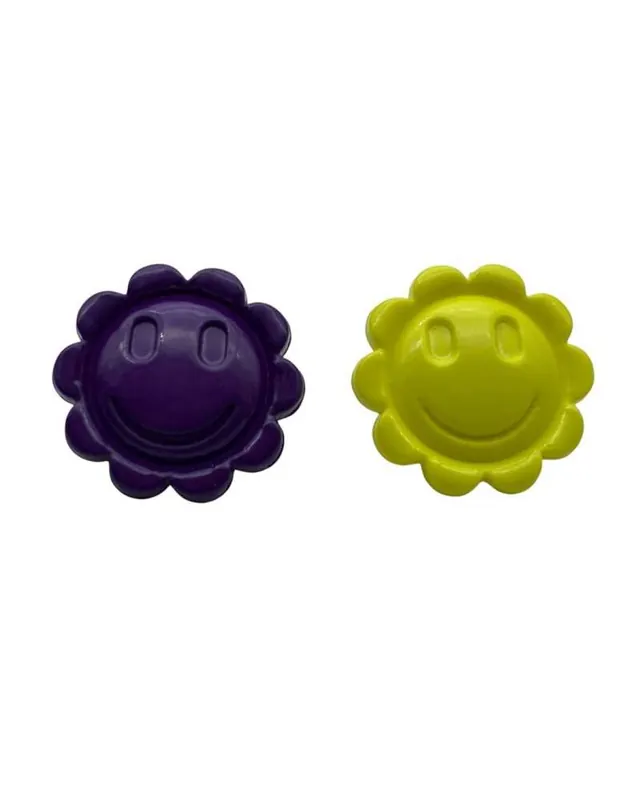 Bottoncino decorativo in plastica – Sole sorridente – Ø 15 mm – colori Giallo e Viola Un raggio di allegria per le tue creazioni handmade ☀️ Questo bottoncino sagomato a forma di sole con volto sorridente è realizzato in plastica opaca, disponibile in due varianti: viola e giallo intenso. Perfetto per decorare abbigliamento infantile, accessori, articoli DIY e progetti creativi pieni di energia.
