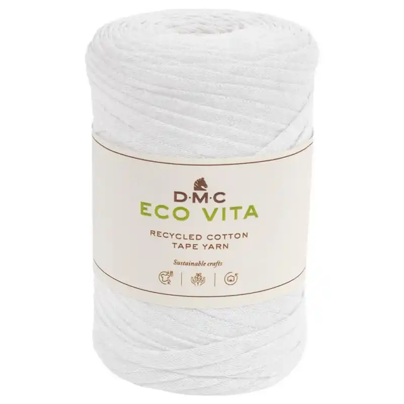 DMC Eco Vita Tape Yarn è un filato fettuccia composto per l’80% da cotone riciclato e per il 20% da poliestere riciclato, che lo rende un materiale sostenibile perfetto per creare accessori decorativi per la casa, come cestini, cuscini, tappeti e persino borse per te. È adatto per lavorare con ferri da maglia o uncinetto con uno spessore da 10 a 12 mm.