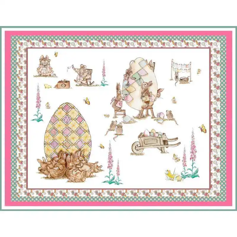 Topini e coniglietti collaborano per l’allestimento pasquale del Villaggio ma invece di dipingere le uova le decorano con tanti ritagli di tessuti, creando così delle originali uova patchwork.