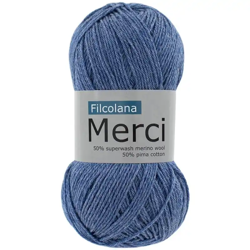 Filcolana Merci è un filato che combina fibre di lana con cotone e risulta in un filo sottile, morbido al tatto e ideale per neonati, bambini e adulti. Il filo è filato a 4 capi intrecciati con una torsione facile da lavorare.
