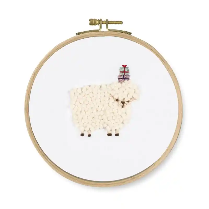 Questo kit contiene tutti i materiali necessari per completare questa carina pecora con regali sulla testa: la tela con il disegno stampato, i filati di cotone, l’ago da ricamo, il telaio e le spiegazioni passo dopo passo.