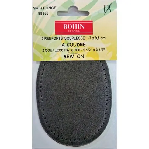 2 piccoli rinforzi elasticizzati da cucire in colore grigio scuro, dimensioni 7 x 9,50 cm.
