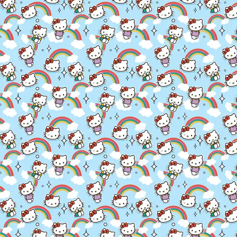 Il tessuto in colore azzurro cielo presenta un stampa della famosa gattina Hello Kitty intorno a nuvole e arcobaleni. Questa fantasia così colorata e originale è perfetta per neonati e bambini.