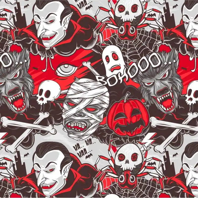 - Stampa del terrore con teschi, ragnatele, vampiri, fantasmi, mummie, pipistrelli, zucche, ecc.