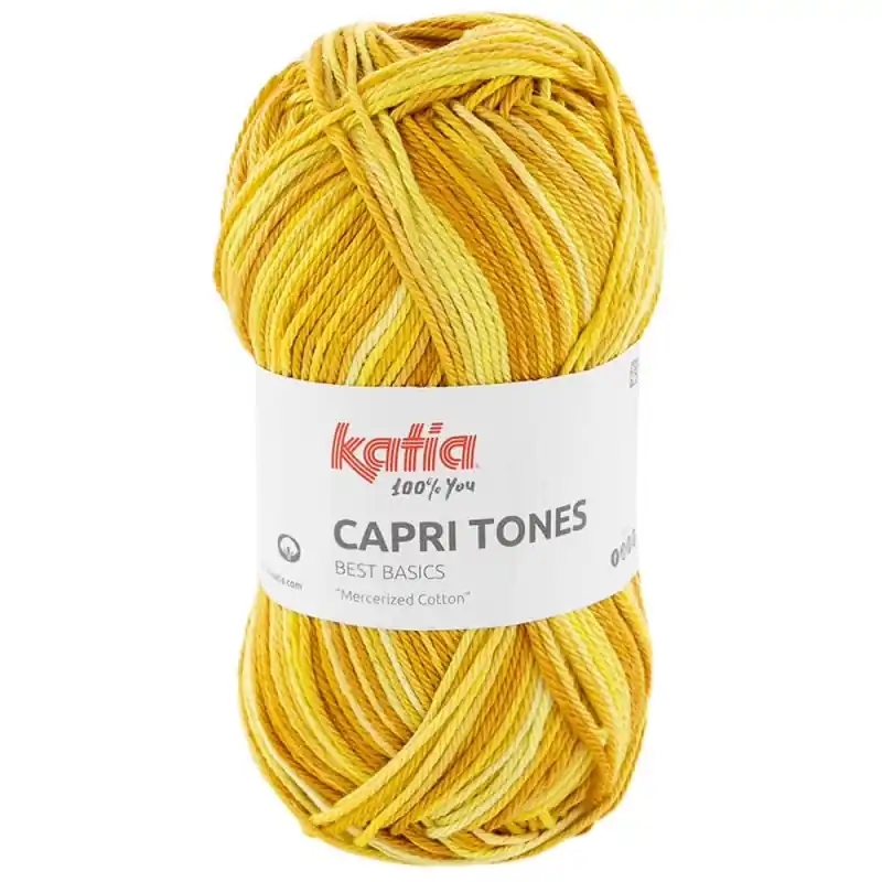 Katia Capri Tones è un filo di cotone mercerizzato con una sottile stampa delavé che gioca con tonalità della stessa famiglia di colore, creando un bellissimo effetto sbiadito.