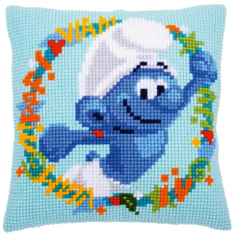 Il Kit cuscino punto croce Forzuto di Vervaco ti permette di realizzare un disegno spettacolare e coloratissimo del Puffo Forzuto, il puffo più forte di tutti.