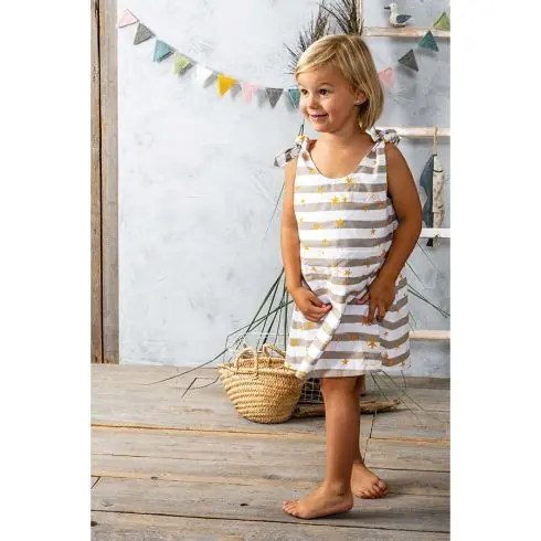 – Tessuto 100% cotone a righe bianche e grigie e stelle gialle