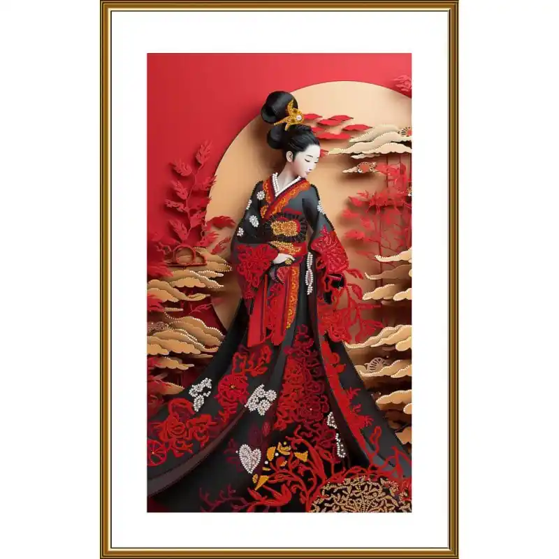 Rivivi l’arte tradizionale con un tocco di brillantezza ed eleganza grazie al Kit da Ricamo con Perline Shidna Beauty di Nova Sloboda. Questo kit rappresenta una figura femminile ispirata all’estetica orientale, vestita con un kimono nero ornato da complessi motivi floreali in rosso, oro e bianco, tutti esaltati da dettagli ricamati con perline che aggiungono profondità, texture e un effetto visivo spettacolare.
