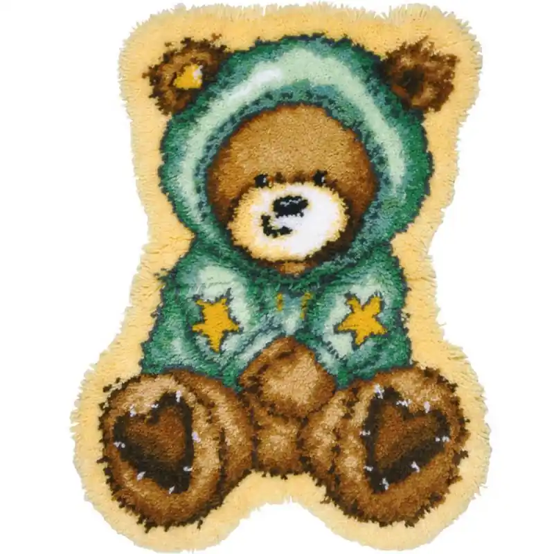 Il Kit di Latch Hook – Popcorn Star Sweater di Vervaco comprende tutti i materiali essenziali per creare un bellissimo tappeto a forma di orsetto, perfetto per arredare le camerette dei bambini.