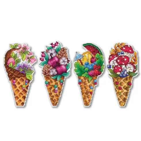 Scopri questo pacchetto di 4 ornamenti da ricamare raffiguranti coni gelato per ogni stagione! Ordina questo set e risparmia il 10%.