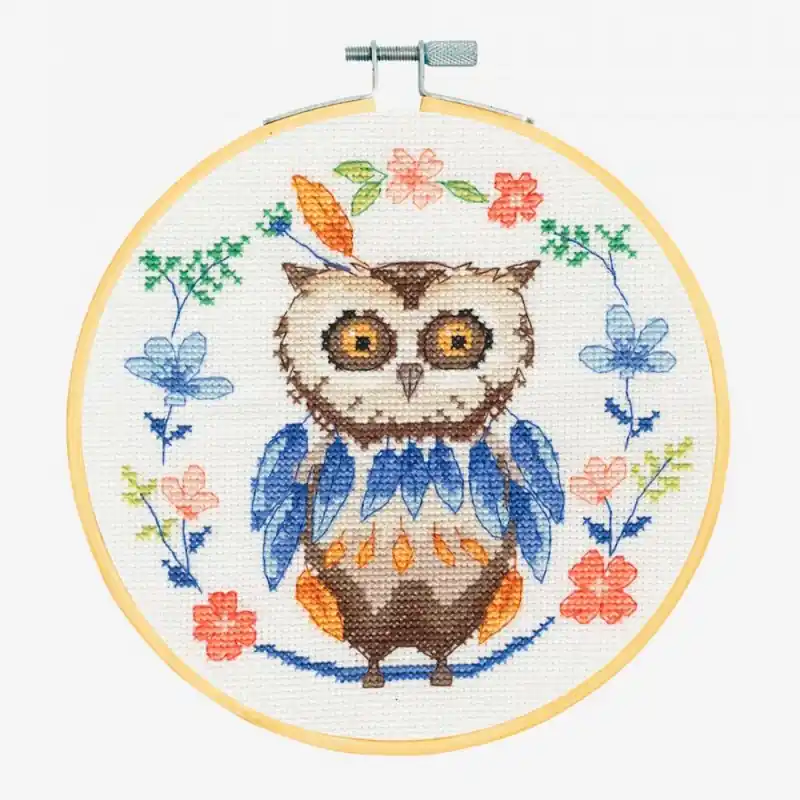 Il Kit di Punto Croce – Il Bel Gufo di DMC include tutti i materiali necessari per completare questo disegno di un gufo ricamato a punto croce con fiori intorno. Contiene anche un telaio da ricamo in legno da 18 cm di diametro.