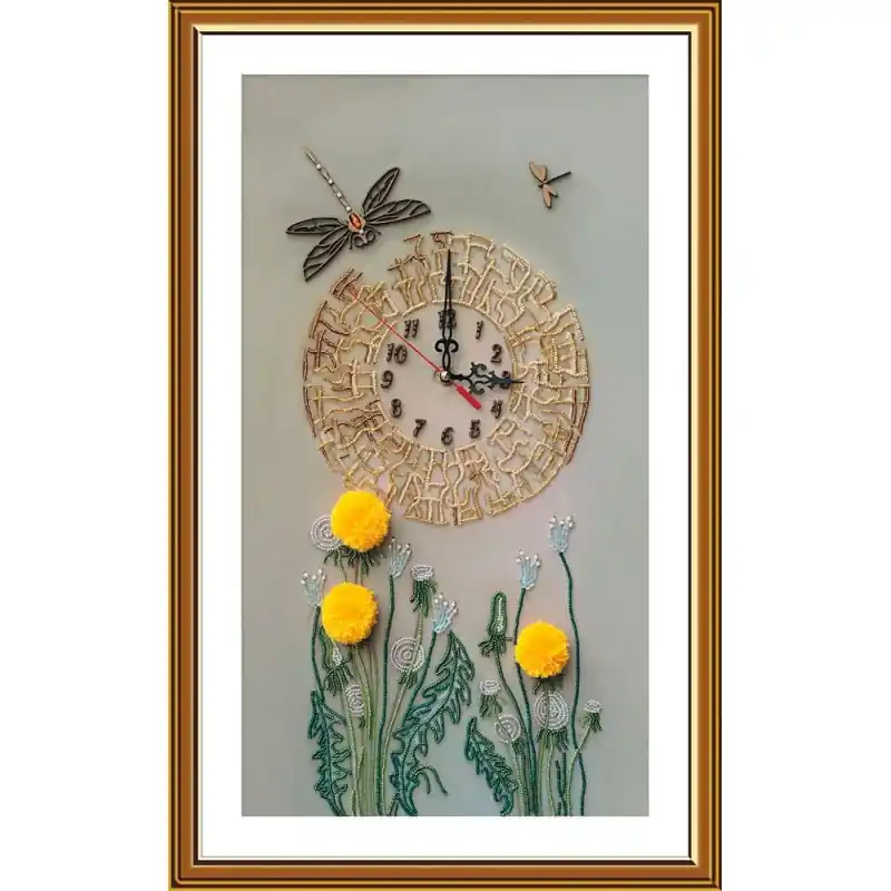 Il design rappresenta un orologio centrale circondato da motivi naturali, come soffioni ricamati con perline, foglie verdi e libellule decorative. La composizione è accuratamente realizzata su un tessuto di gabardina stampato e include: