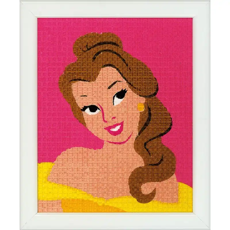 La misura finale dell’arazzo è di 12,5 x 16 cm con un bello disegno di Bella. Bella è la protagonista del famoso film di Disney “La Bella e la Bestia”. Questa principessa indossa il suo abito caratteristico in giallo e ha i capelli castani raccolti. Lo sfondo del quadro è rosa.