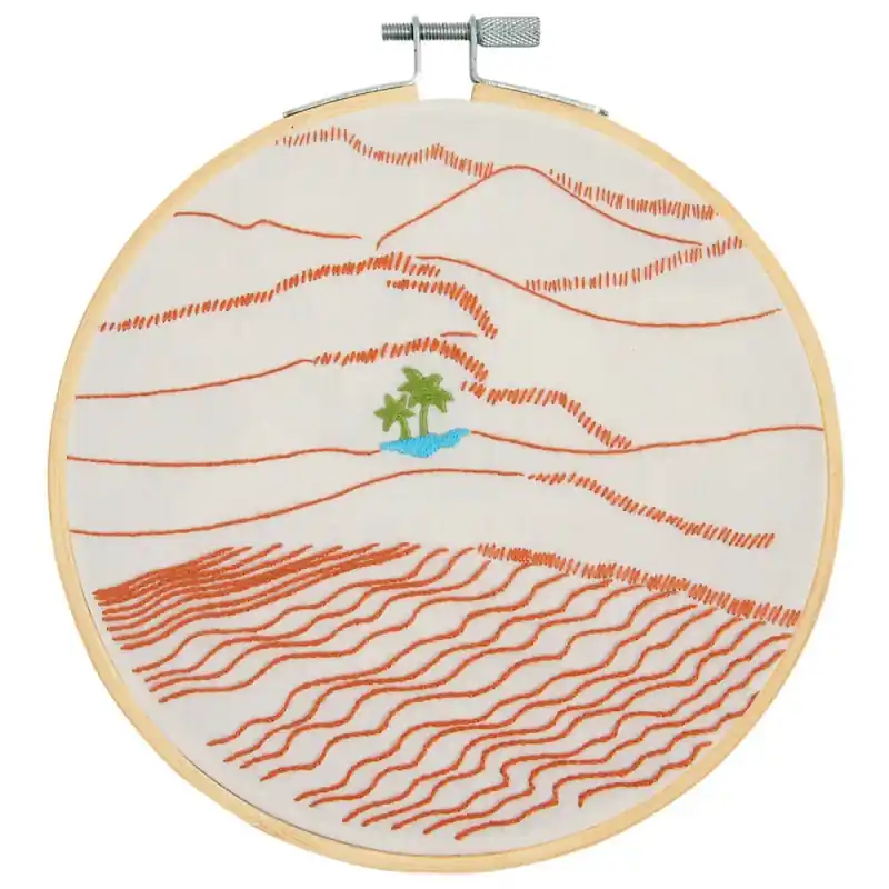 Il kit comprende tutti gli elementi essenziali per dar vita a questo paesaggio squisito: un generoso pezzo di tessuto color sabbia di 25 x 25 cm, fili per ricamo meticolosamente organizzati, un telaio in legno di 15 cm di diametro, un ago da ricamo e un dettagliato schema che ti guiderà in ogni passo del progetto.