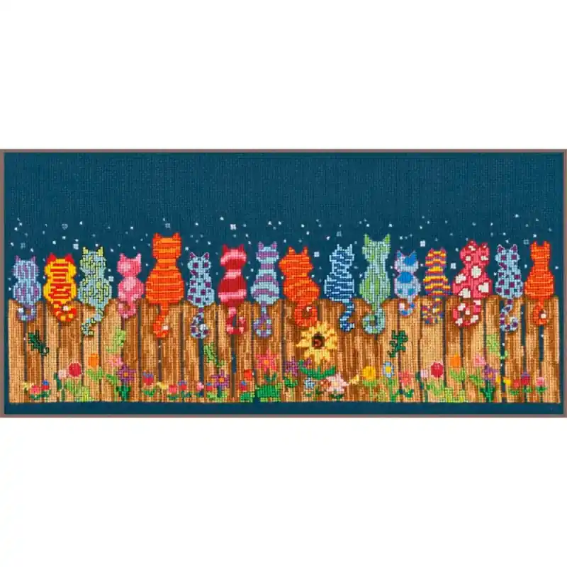 Il Kit Kit Punto Croce – Gatti sulla Staccionata di Veraco è un incantevole design che unisce colore, gioia e creatività in un pezzo unico. Rappresenta un gruppo di simpatici gatti multicolori seduti su una recinzione di legno sotto un cielo stellato, circondati da fiori. Un progetto divertente e vivace, ideale per gli amanti degli animali e del ricamo a punto croce.