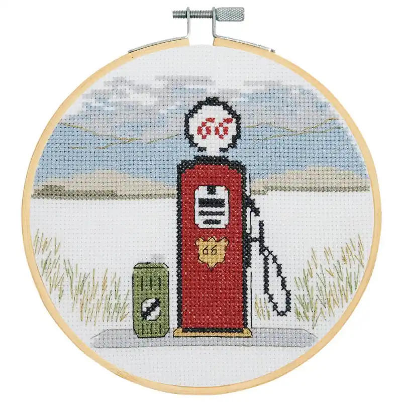 Il Kit di Punto Croce – Stazione di Servizio – DMC appartiene alla collezione “Il Sogno Americano” e include tutto il necessario per ricamare un autentico distributore di benzina americano: tela Aida, fili accuratamente selezionati, un telaio in legno di 15 cm, un ago da ricamo e un dettagliato schema in formato A3.