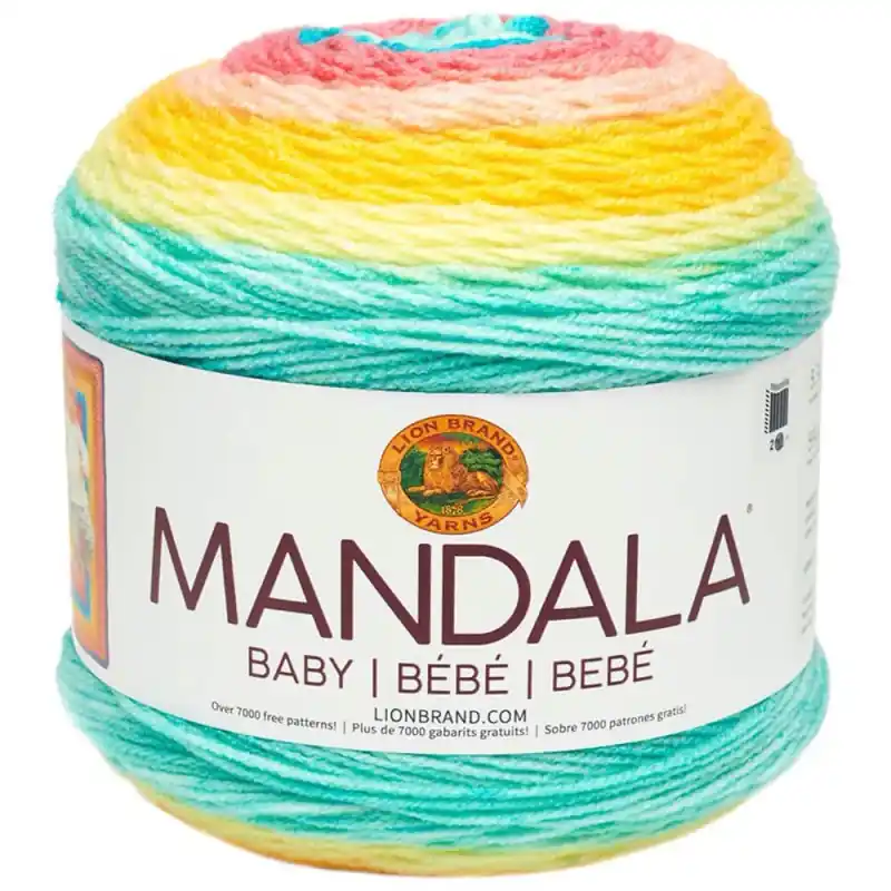 Mandala Baby è un filato acrilico di Lion Brand, progettato per lavorare a maglia vestiti e accessori per neonati. Si presenta in palline a forma di cake, con una miscela di colori che formeranno spessi tessuti a righe con colori diversi.